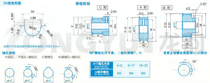 规格 | 形状 | 节径P.D | 外径O.D | 挡边外径F | 挡边内径M | 轮毂直径Dm | 内孔dH7 | |||||