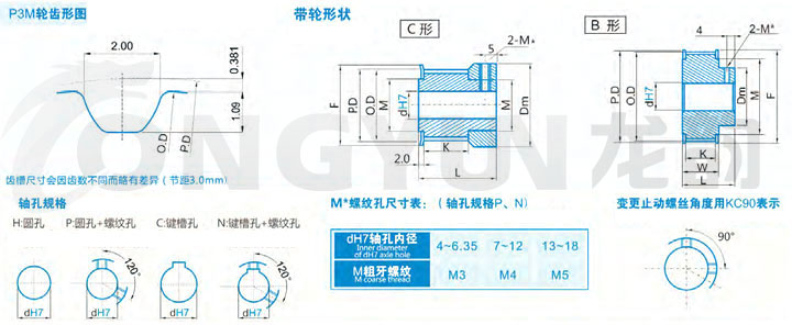 规格 | 形状 | 节径P.D | 外径O.D | 挡边外径F | 挡边内径M | 轮毂直径Dm | 内孔dH7 | ||||