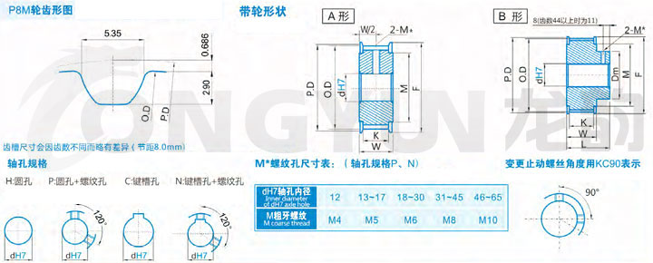 规格 | 形状 | 节径P.D | 外径O.D | 挡边外径F | 挡边内径M | 轮毂直径Dm | 内孔dH7 | ||||