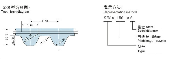 三个部分:指示带的长度,间距和宽度带回来的部分号码。如下图所示。此S2M橡胶单面齿同步带型号,节线长为156mm,带宽6mm。