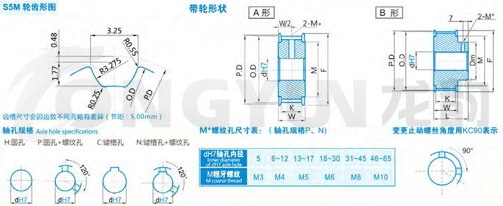 规格 形状 节径P.D 外径O.D 挡边外径F 挡边内径M 轮毂直径Dm 内孔dH7