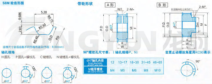 规格 | 形状 | 节径P.D | 外径O.D | 挡边外径F | 挡边内径M | 轮毂直径Dm | 内孔dH7 | |||||