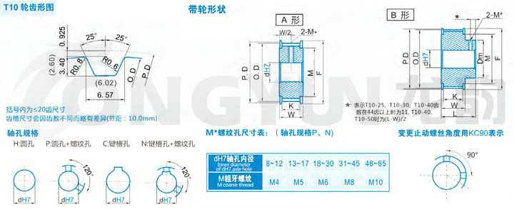 规格 | 形状 | 节径P.D | 外径O.D | 挡边外径F | 挡边内径M | 轮毂直径Dm | 内孔dH7 | |||||